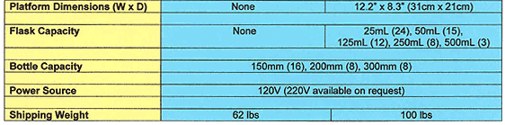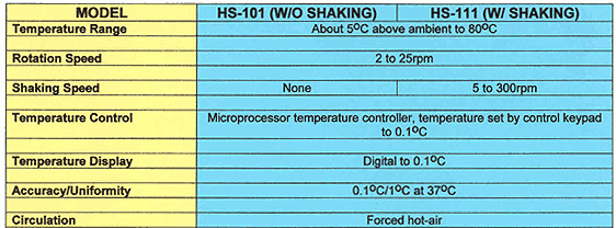 the entire stainless steel chamber. The rotisserie can accommodate eight or sixteen 40-mm tubes, depending on their length. For tri-directional rotation, one can easily offset the two tube holders of the rotisserie assembly by up to 20 degrees to generate a rotary action that moves liquid from one end of the tube to the other. The resulting greater rigorous washing action allows the use of less probe solution and effects greater hybridization efficiency. The HS-111 increases the versatility of a hybridization oven by incorporating a platform for shaking Erlenmeyer flasks of size up to 500 mL. By removing the rotisserie from the chamber, and this can be done in seconds, the platform can accommodate a 6-liter flask. The platform can also be used for slowly shaking a tray used in wash procedures, and is more convenient than removing the rotisserie and replacing it with a rocker attachment. A unique, dynamically-balanced triple eccentric drive provides smooth and quiet shaking up to 300 RPM, making the HS-111 a true incubator shaker for bacteria or cell culture. The HS-101 is similar to the HS-111,