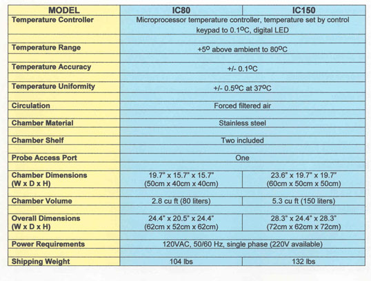 seal. A refrigerated model, IC150R, is suitable for applications at/or below ambient temperature. An electrical outlet enables small laboratory equipment to be operated inside the chamber. An inner glass door minimizes temperature changes when the outer door is opened during observation. All three models are equipped with